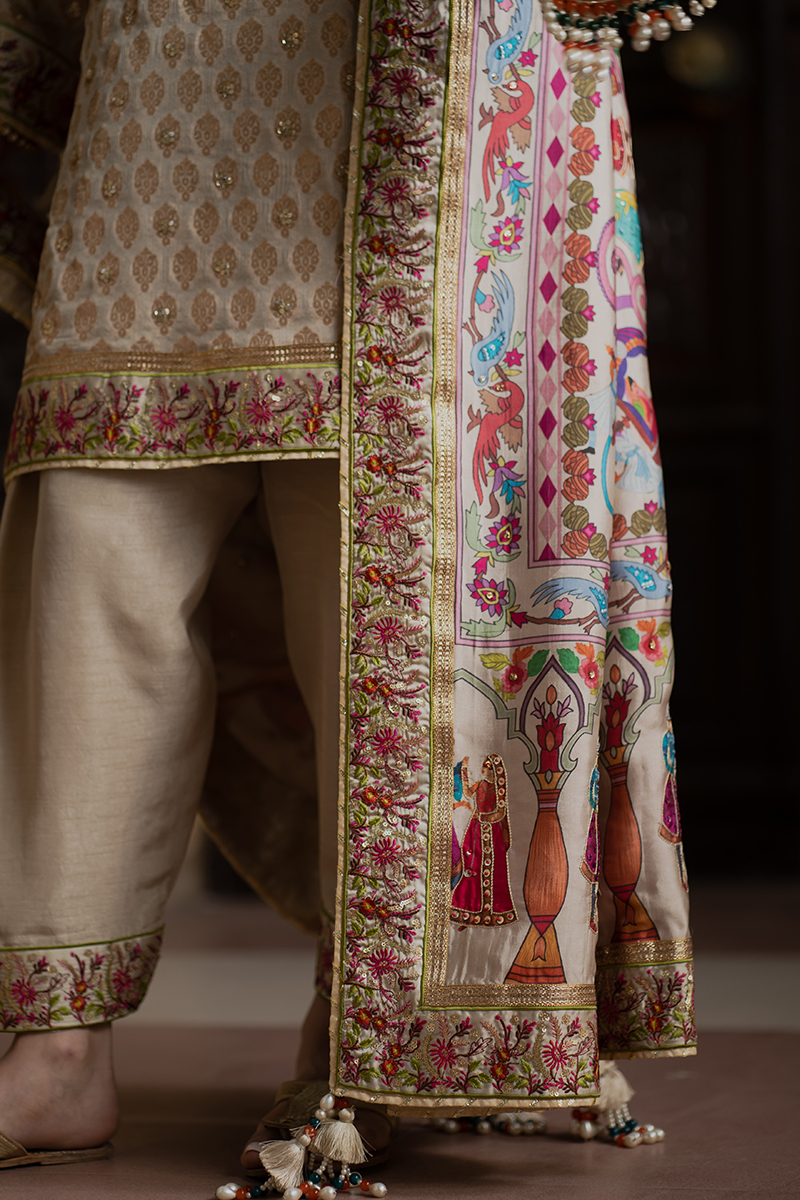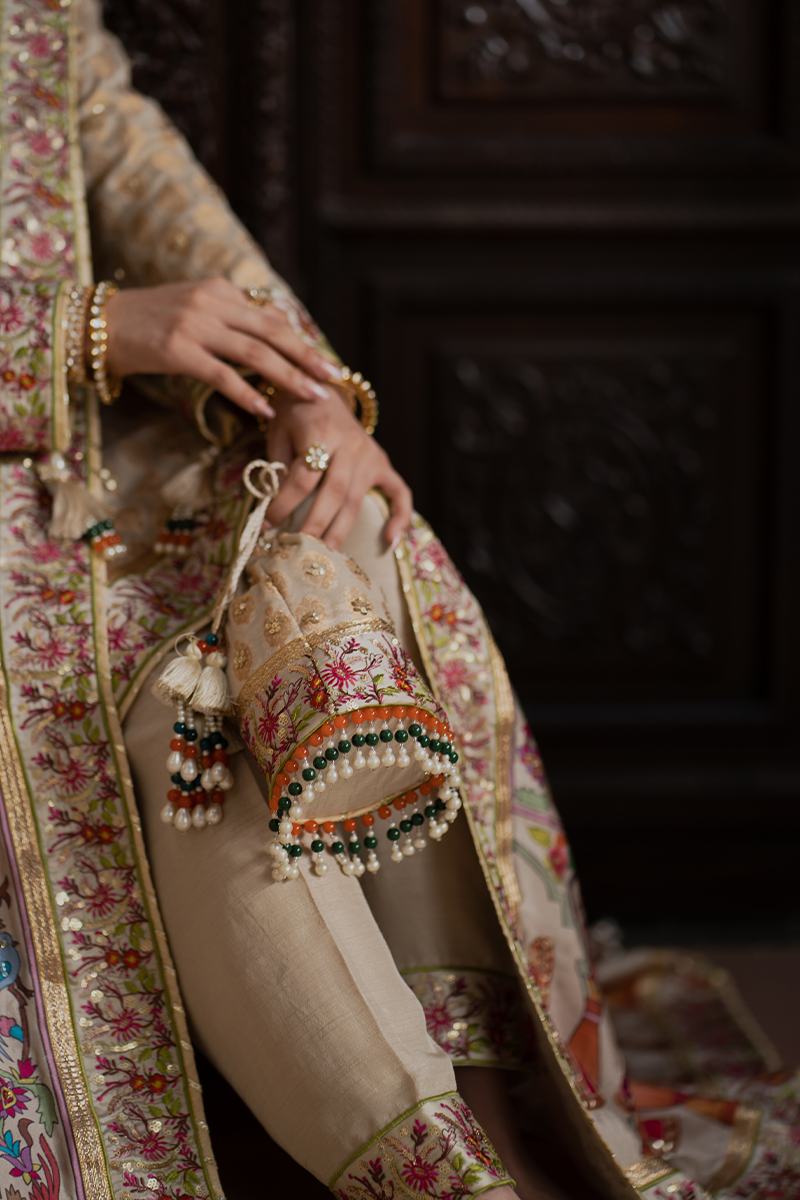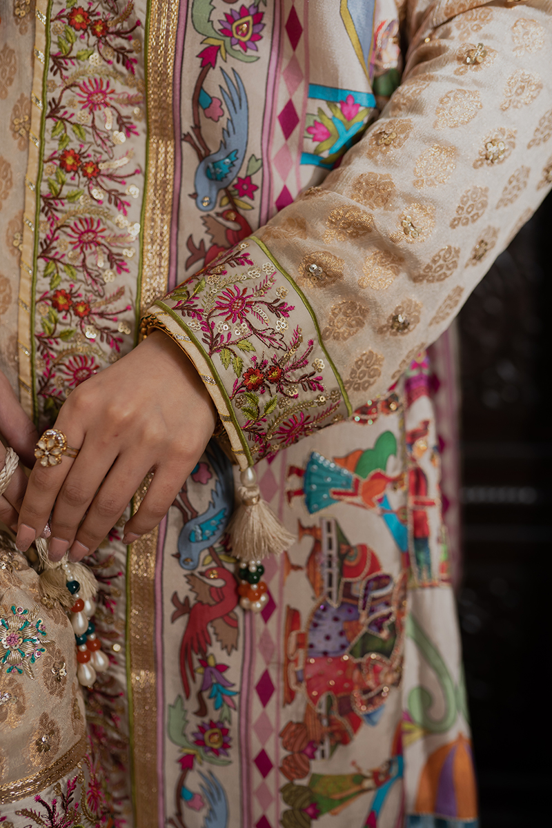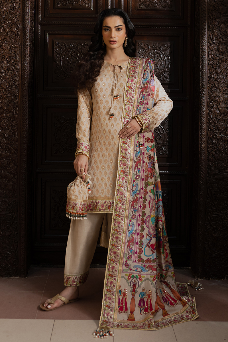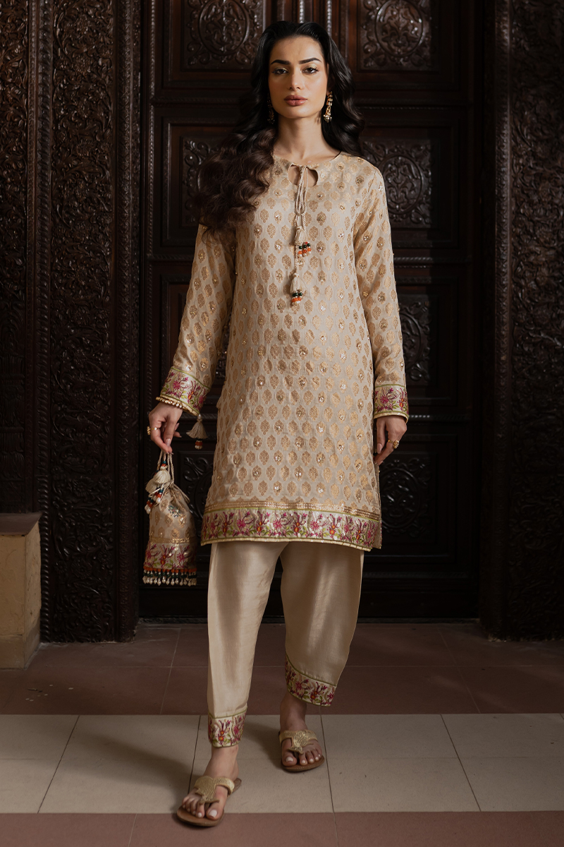 Crafted from sumptuous raw silk, this suit glimmers with lavishly embroidered and embellished tilla borders for a dramatic, high-fashion appeal. The combination of rich texture and luminous detailing creates a glamorous aura from every angle. A perfect pick for standout festive or evening wear.