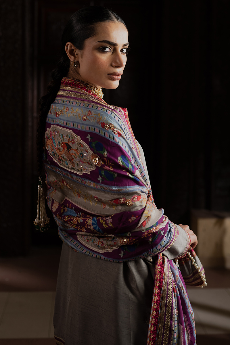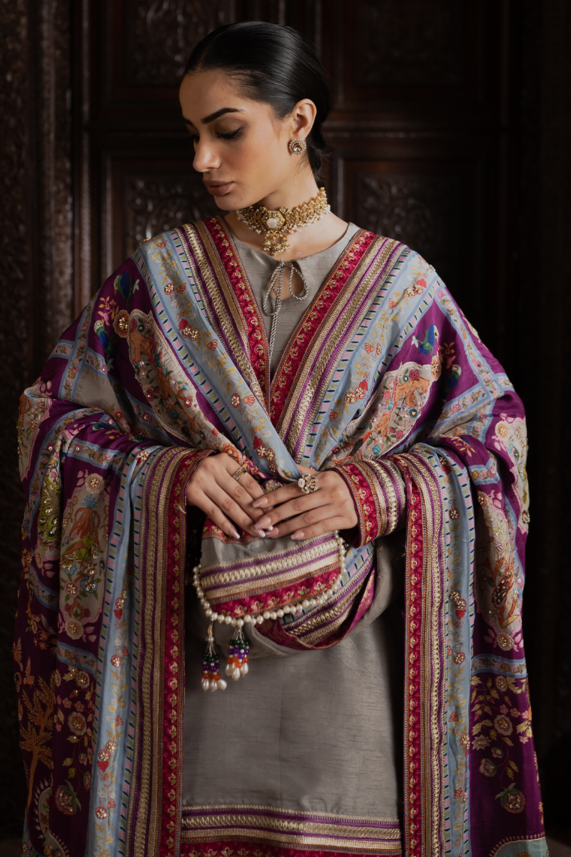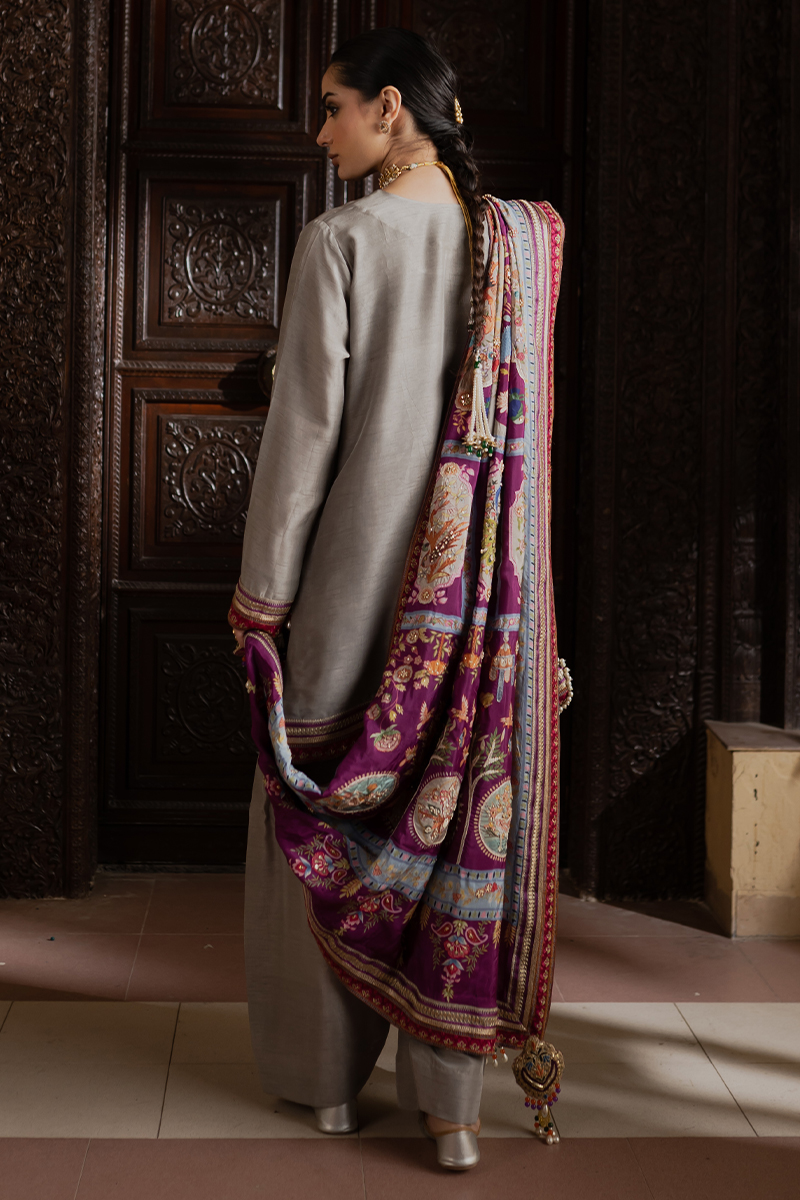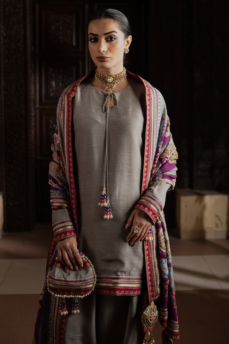 Crafted from premium raw silk, this suit is adorned with embroidered and embellished tilla borders that add a radiant, handcrafted touch. The classic silhouette paired with rich detailing creates an elegant and versatile outfit. Ideal for celebrations or refined evening wear.