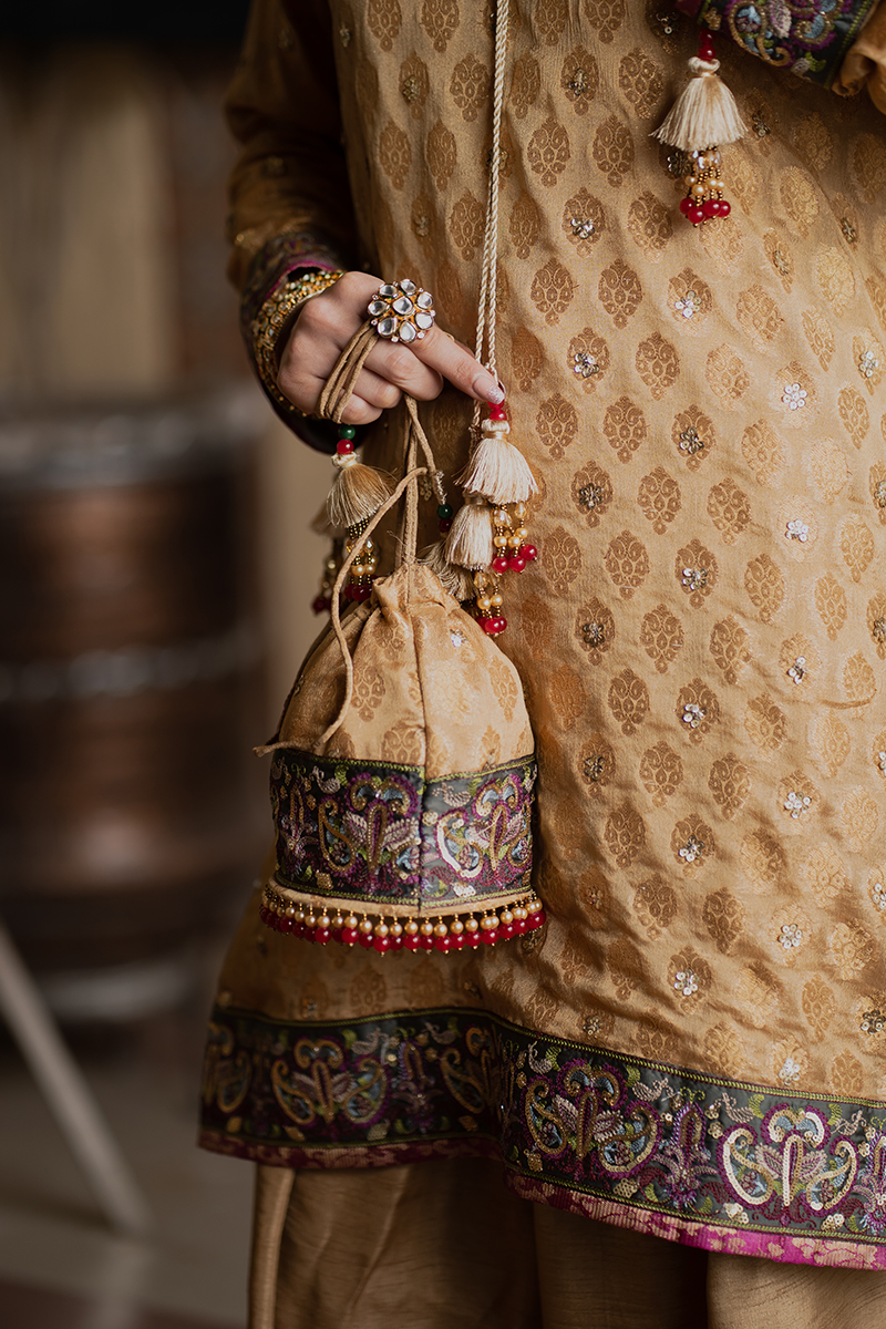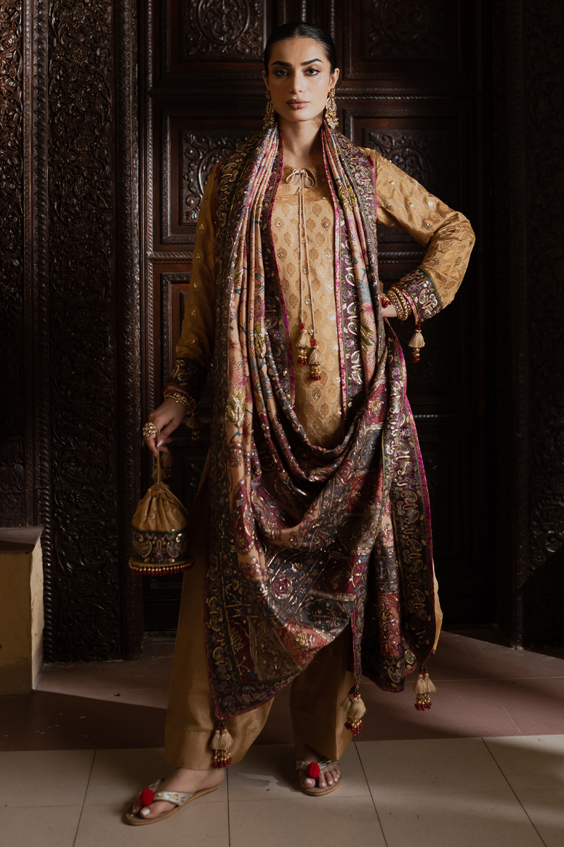 A refined raw silk suit highlighted with delicately embroidered and embellished tilla borders for a luxurious, handcrafted finish. The smooth texture of silk enhances the shine of the tilla work, making the ensemble both graceful and eye-catching. A timeless choice for any festive event.
