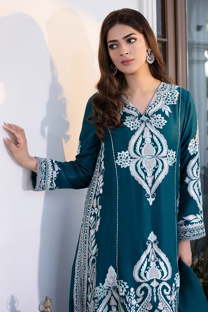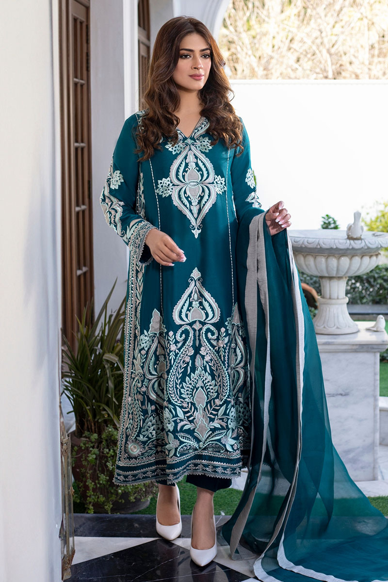 A pure raw silk suit featuring intricate single-needle embroidery, paired with a pure organza dupatta for a timeless, refined look.