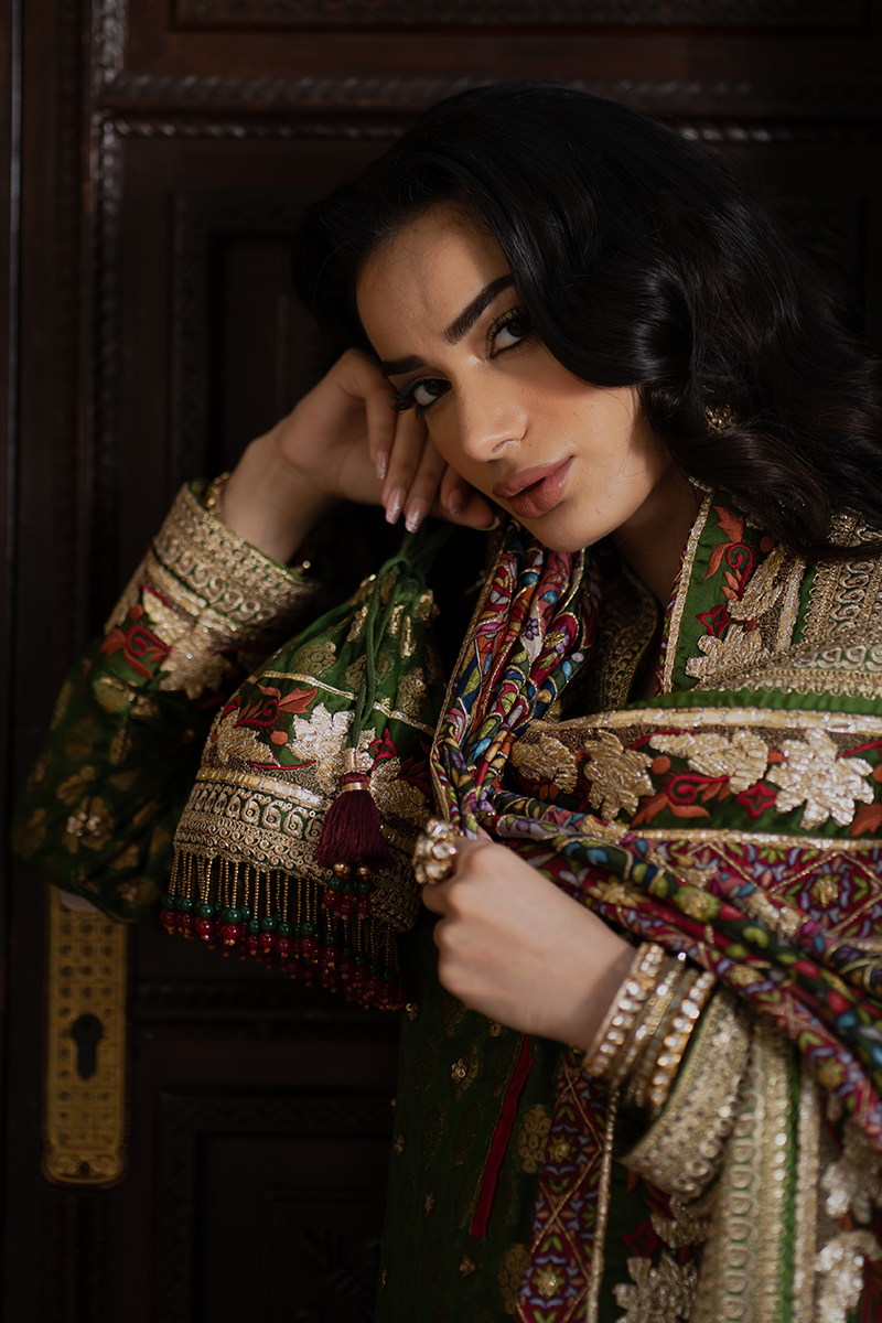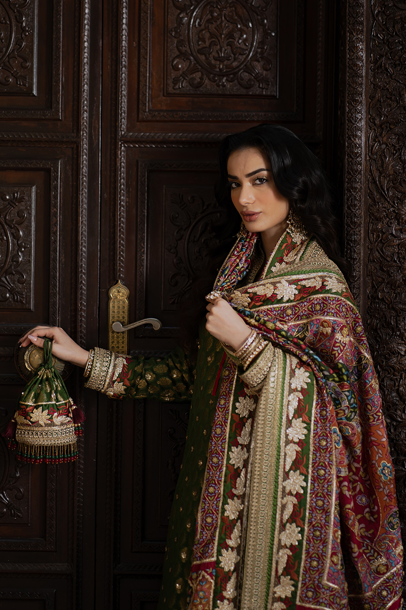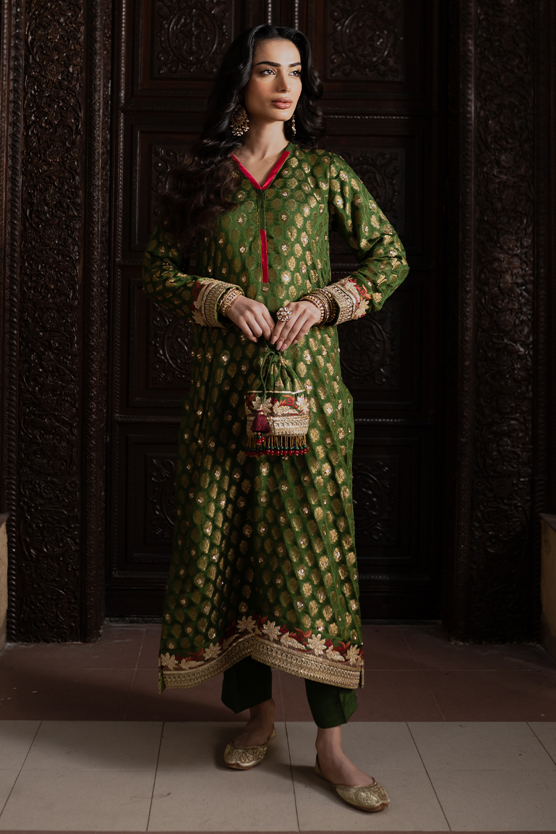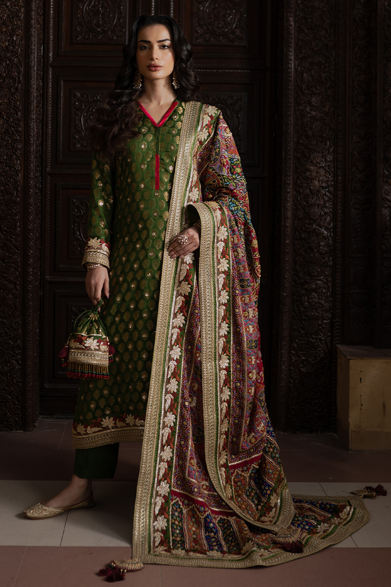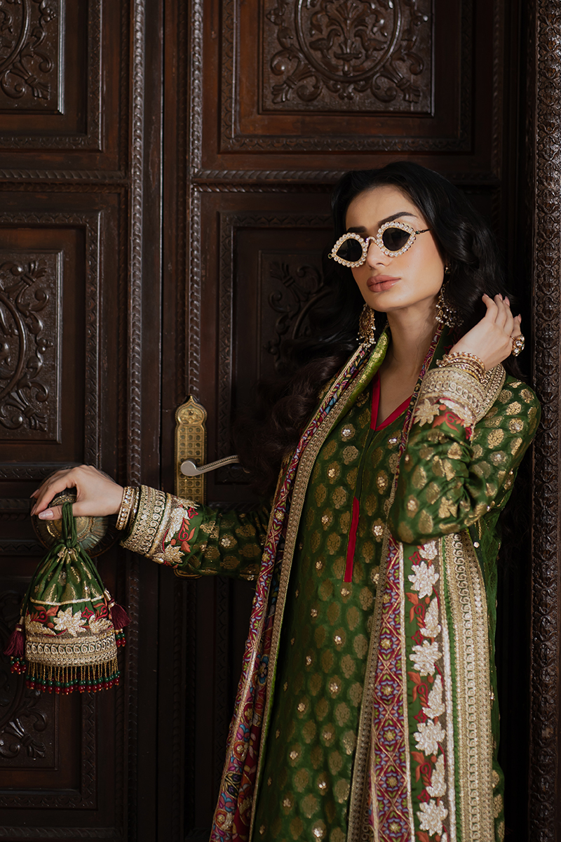 This premium raw silk suit dazzles with its richly embroidered and embellished tilla borders, exuding red-carpet glamour. The lustrous fabric enhances every intricate detail, offering a look that is both bold and breathtaking. An ideal choice for high-end festive soirées.