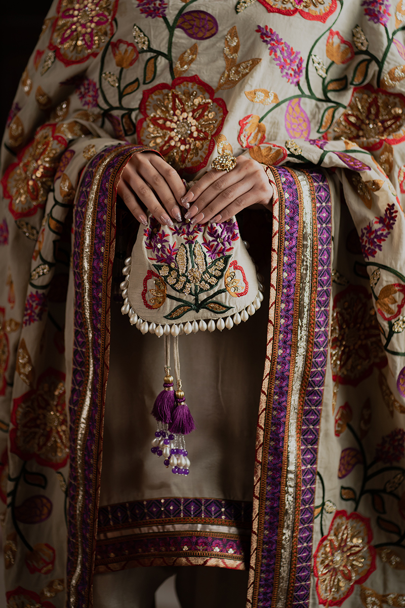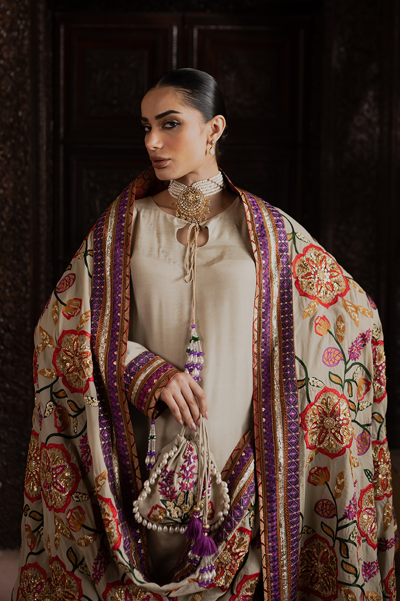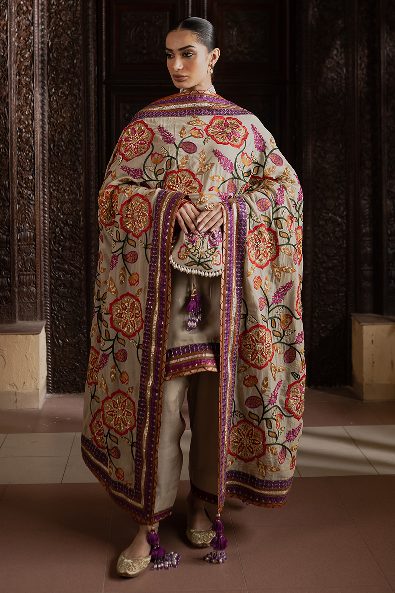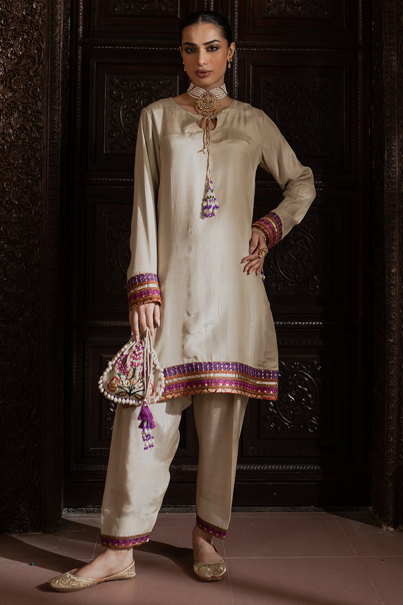 This raw silk suit features beautifully embroidered and embellished tilla borders that elevate its timeless charm. The rich fabric drapes gracefully, while the ornate detailing adds a luxurious festive appeal. A perfect blend of subtle sophistication and statement-making style.