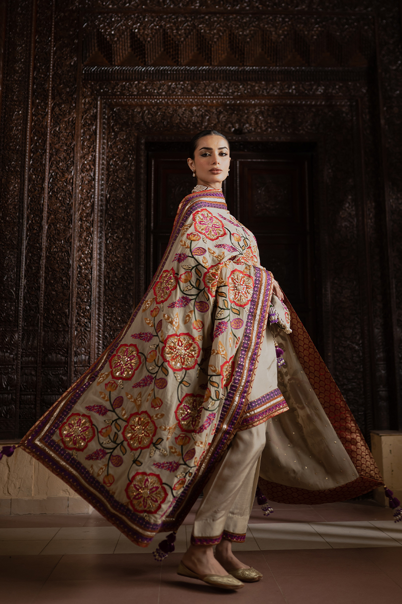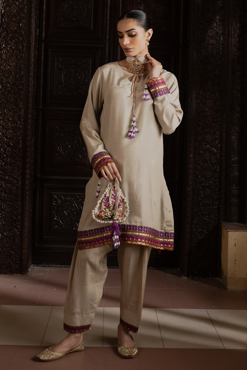 This raw silk suit features beautifully embroidered and embellished tilla borders that elevate its timeless charm. The rich fabric drapes gracefully, while the ornate detailing adds a luxurious festive appeal. A perfect blend of subtle sophistication and statement-making style.