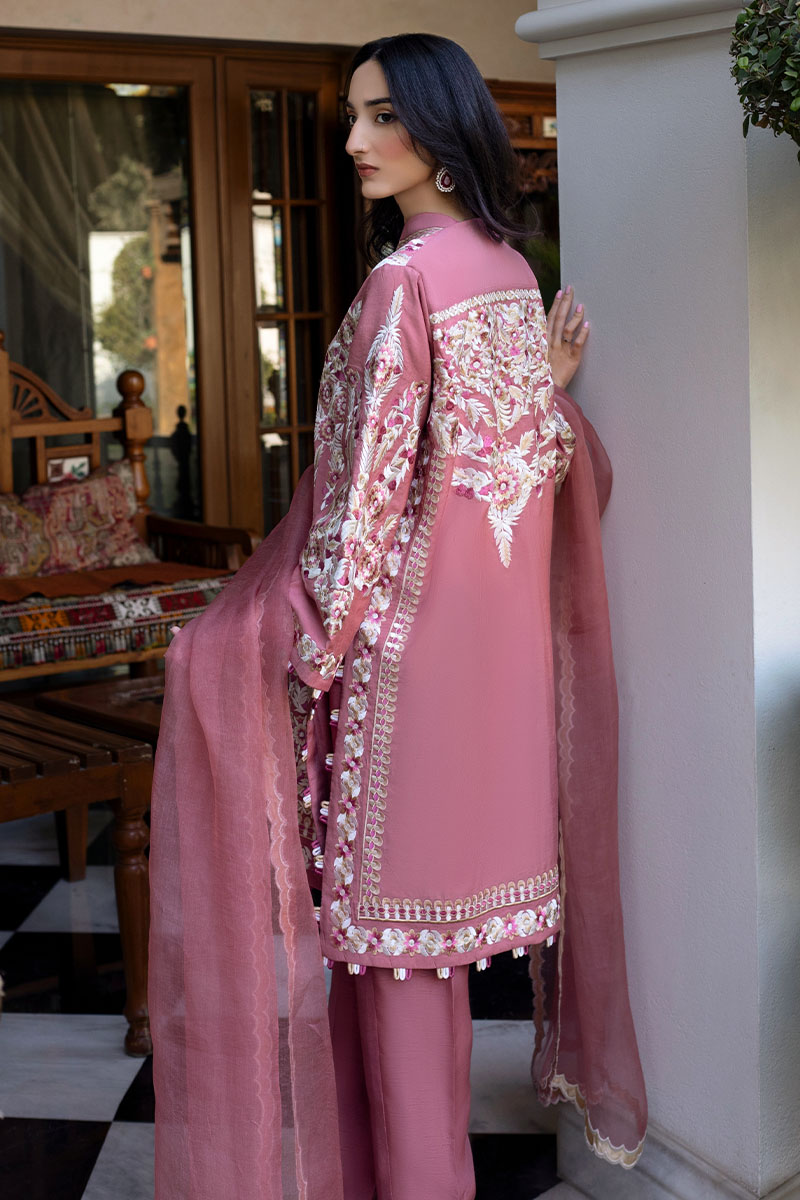 A cotton silk suit featuring full embroidery and beautifully finished edges, paired with a lightweight organza dupatta for an effortlessly elegant look.
