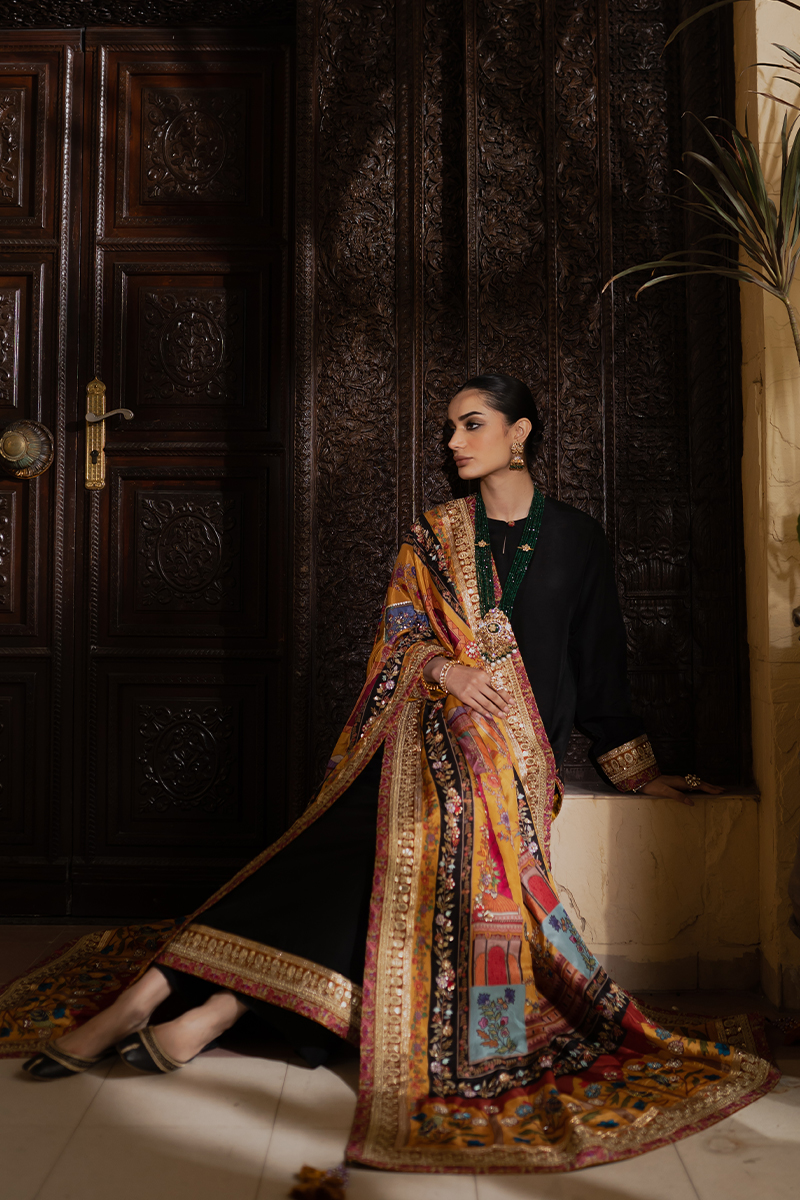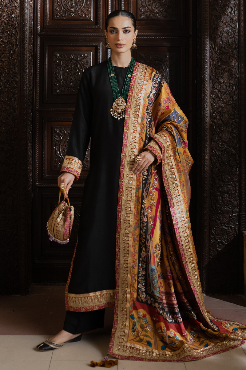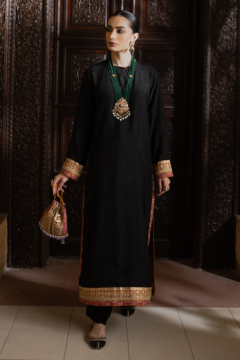 A stunning black raw silk suit enriched with embroidered and embellished gold tilla borders for a refined, regal look. The natural sheen of raw silk complements the intricate craftsmanship, creating an effortlessly elegant ensemble. Perfect for formal and festive occasions.