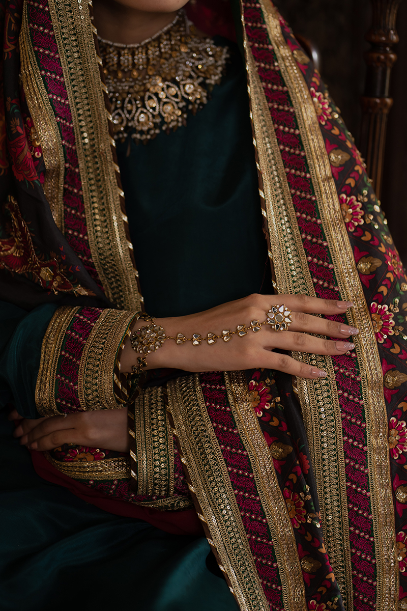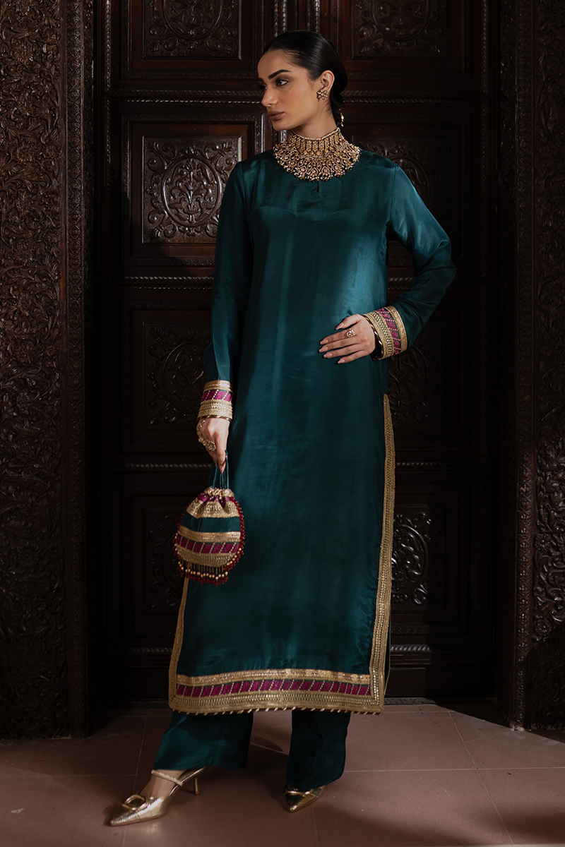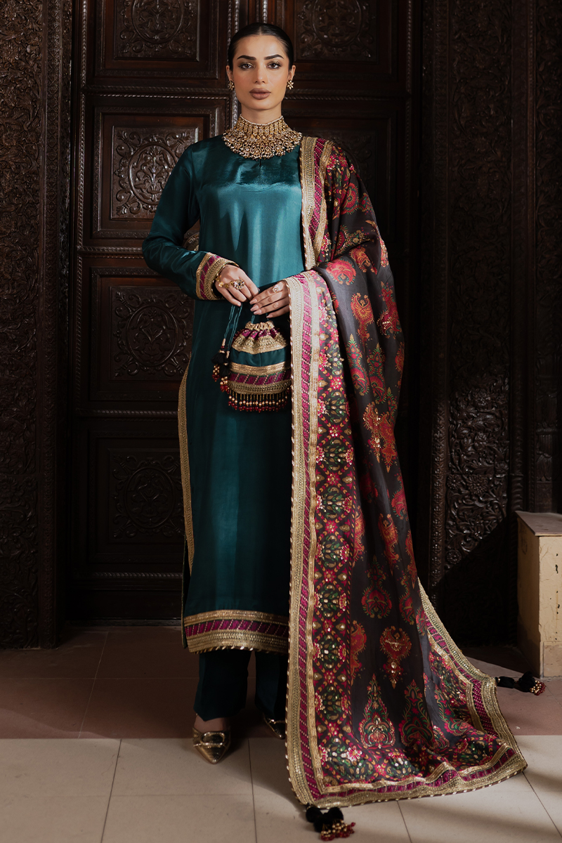 A lavish raw silk suit adorned with exquisitely embroidered and embellished tilla borders, radiating pure opulence. The luxe texture of silk pairs beautifully with the shimmering handcrafted detailing, creating a show-stopping ensemble. Perfect for making an unforgettable entrance at any celebration.